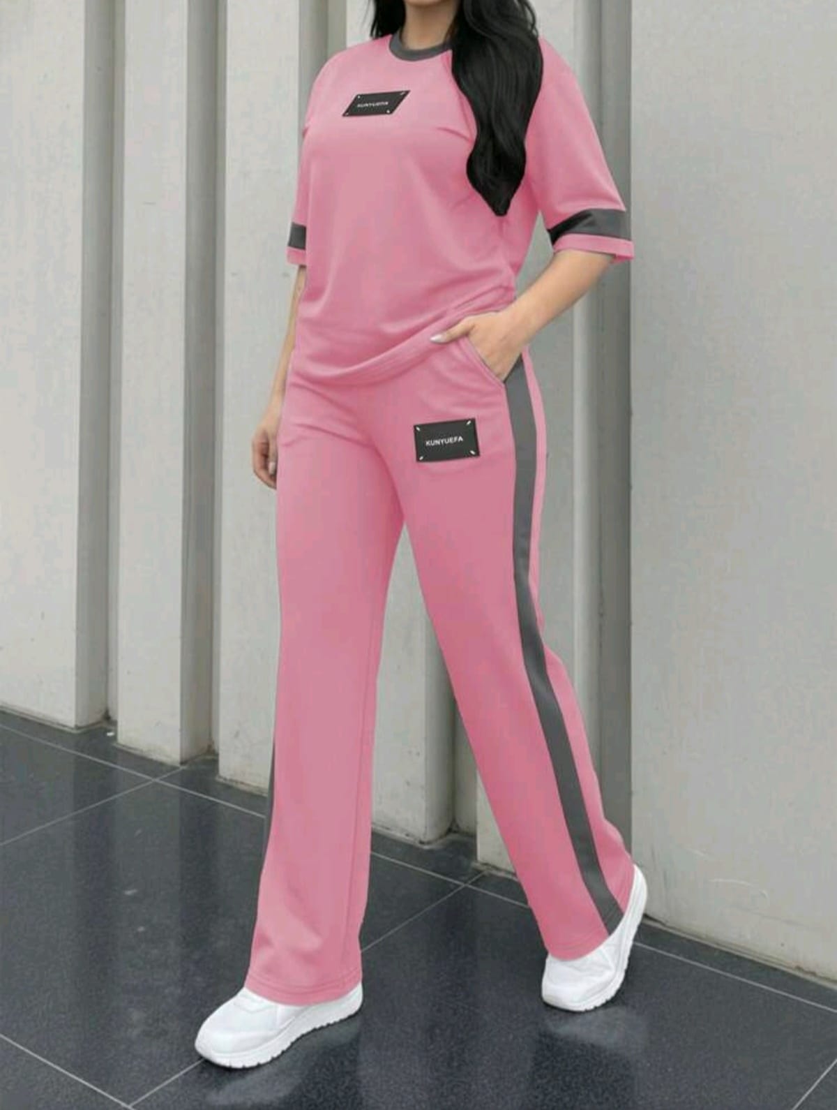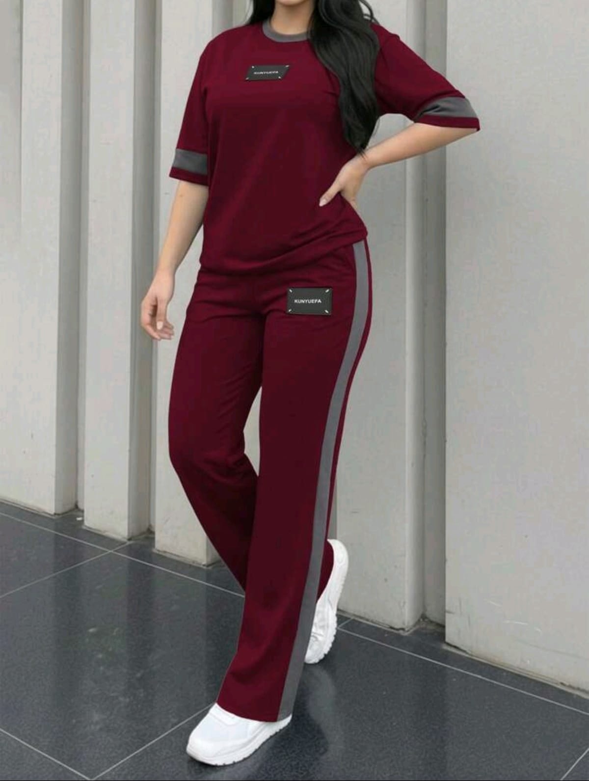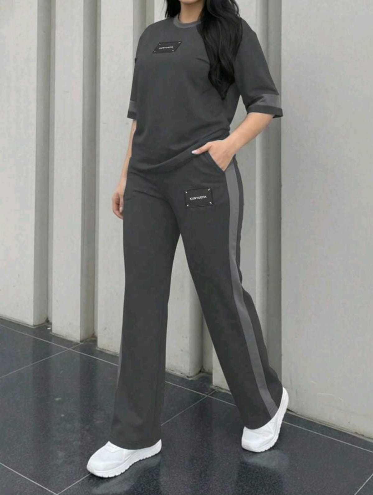 The Top: A relaxed-fit, crew-neck t-shirt with contrasting grey trim on the collar and sleeves. It features a centered “KUNYUEFA” minimalist rubberized patch.